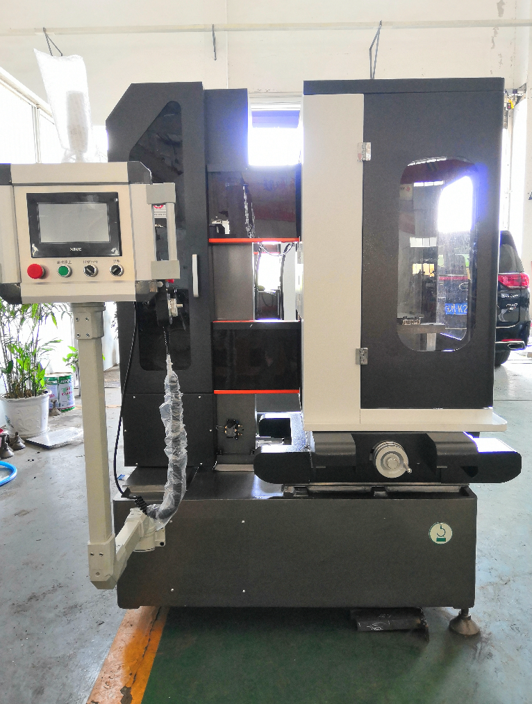 FRY745 型金剛石砂線切割機(jī),是本公司小型金剛石線切割機(jī)之一的非標(biāo)型號機(jī)床。 本機(jī)床使用金剛石線做循環(huán)走絲運動,弩形線架結(jié)構(gòu)使金剛石線運行平穩(wěn)不抖絲, 高精度旋轉(zhuǎn)工作臺,并配有金剛石線彎曲度檢測裝置,保持恒張力切割。機(jī)床主體部件 均采用傳統(tǒng)鑄件,經(jīng)人工時效處理,人工鏟刮修整,確保機(jī)床長期不變形。機(jī)械部分采 用半自動加油泵,拖板采用精密導(dǎo)軌,精密滾珠絲桿傳動,提高機(jī)床精度,主要部件采 用進(jìn)口精密軸承。自主研發(fā)的金剛石線切割專用智能控制系統(tǒng),PLC 觸摸屏操作,環(huán)保 外殼護(hù)罩。本機(jī)具有自動上絲、高速切割、切面表面質(zhì)量像磨床效果、安全高效、操作 簡單等優(yōu)點。